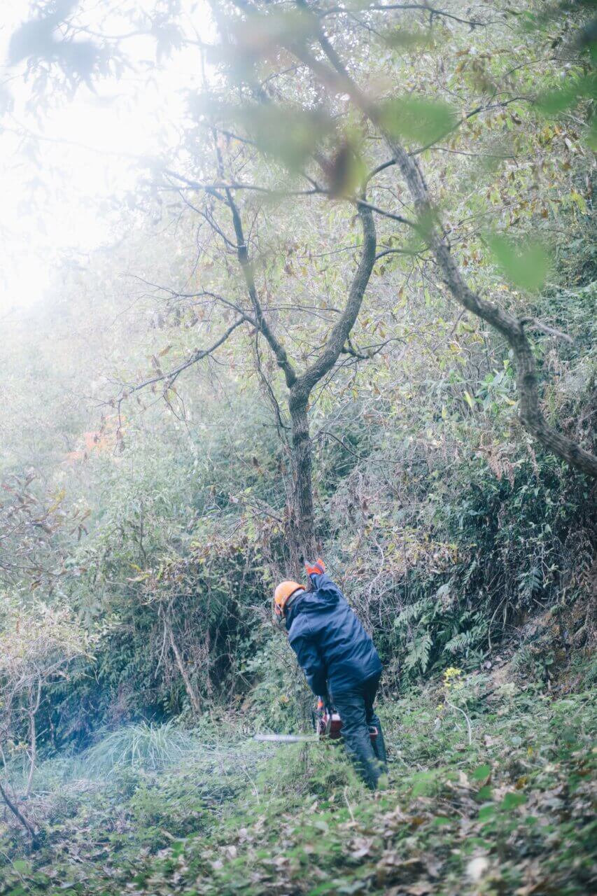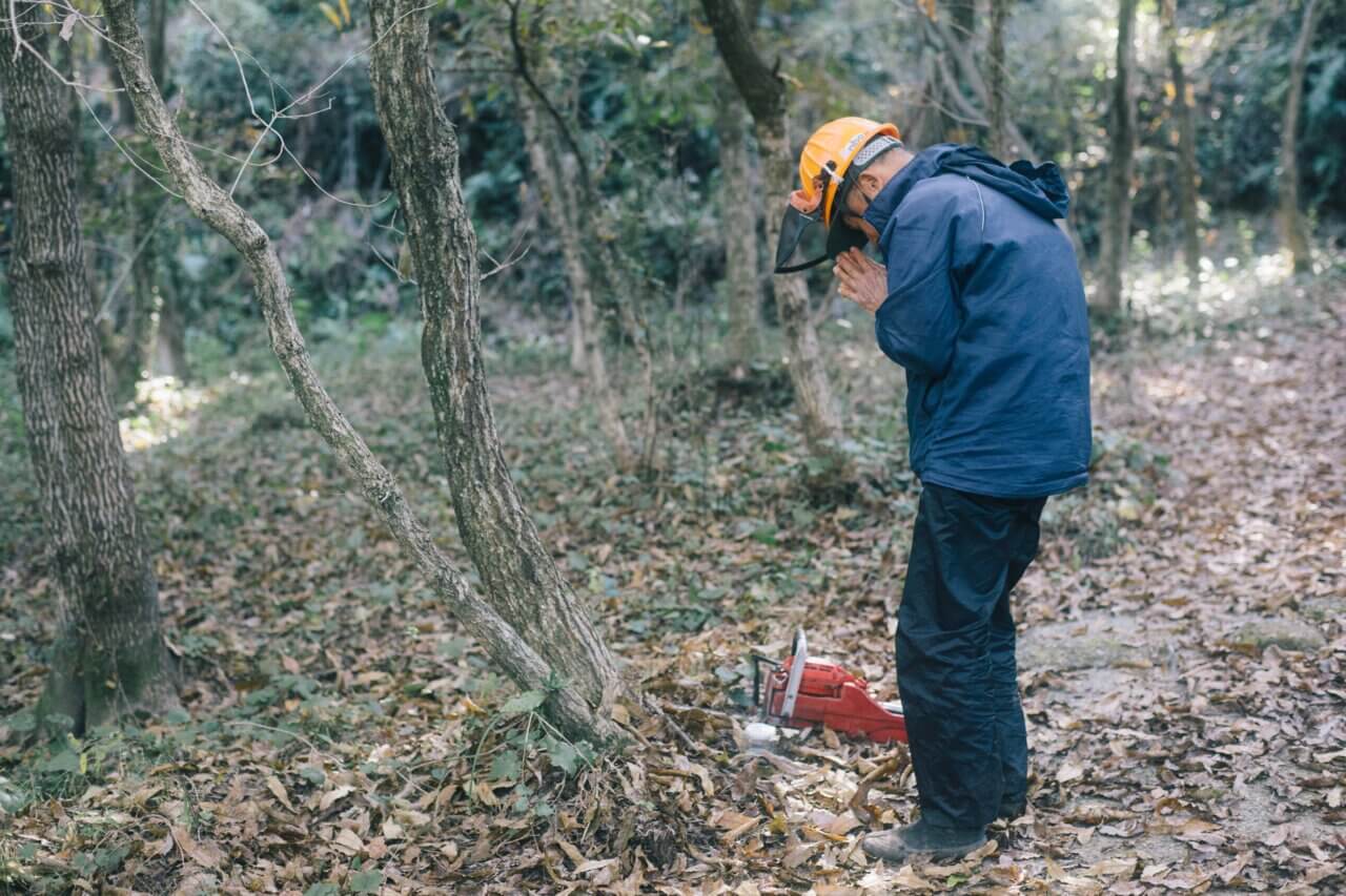 楠本さんの山仕事に同行したのですが、木を切る前に塩と酒でお清めをされていました。これは、木の神様や木霊への畏敬の念を示すとともに、伐採による不幸を避けるためだそう。静かな山のなかで木に向き合う楠本さんの姿は、まさに山の人。この誠実な姿勢は、どんな仕事にも通じるのではないかなと思いました。